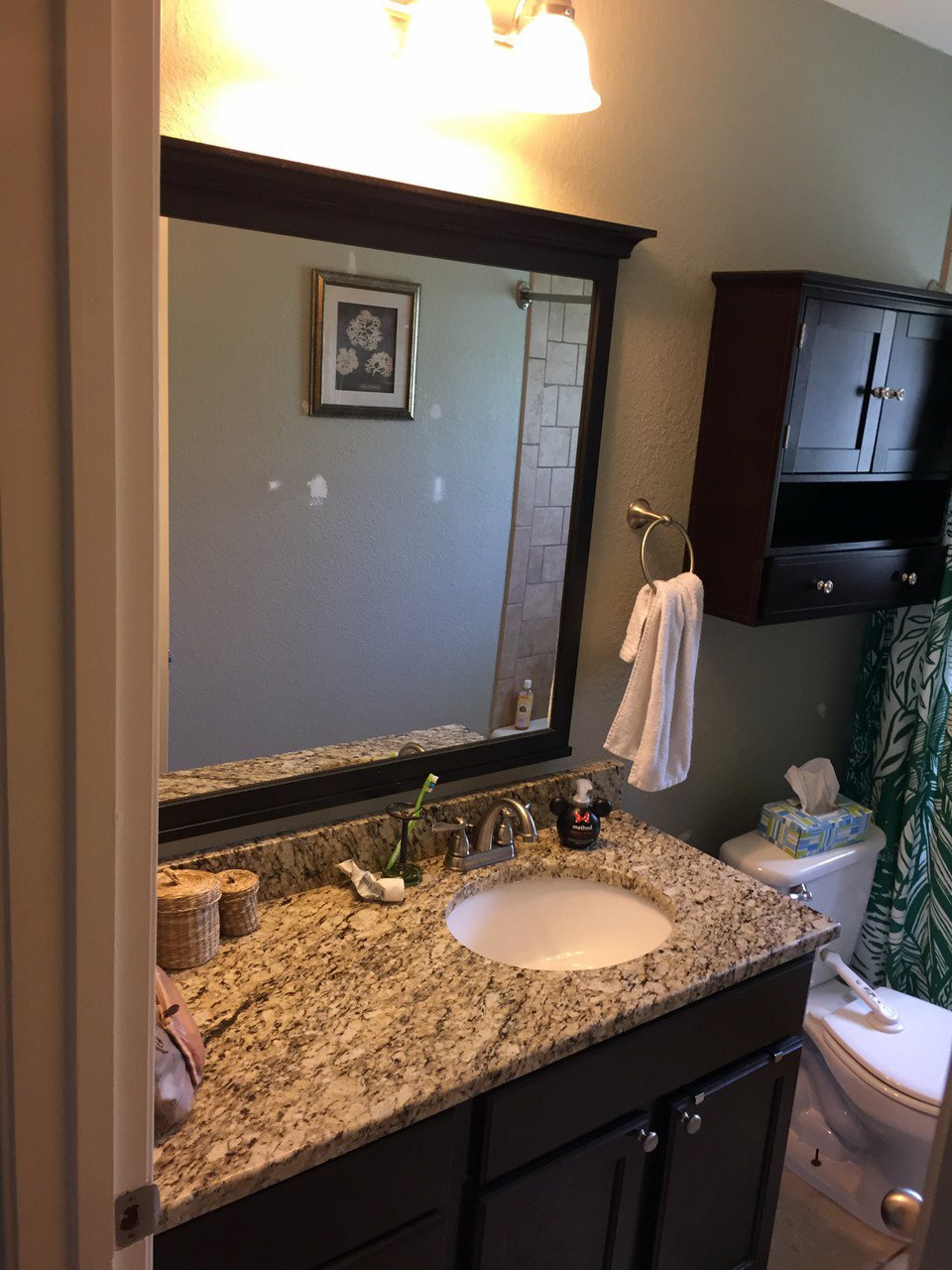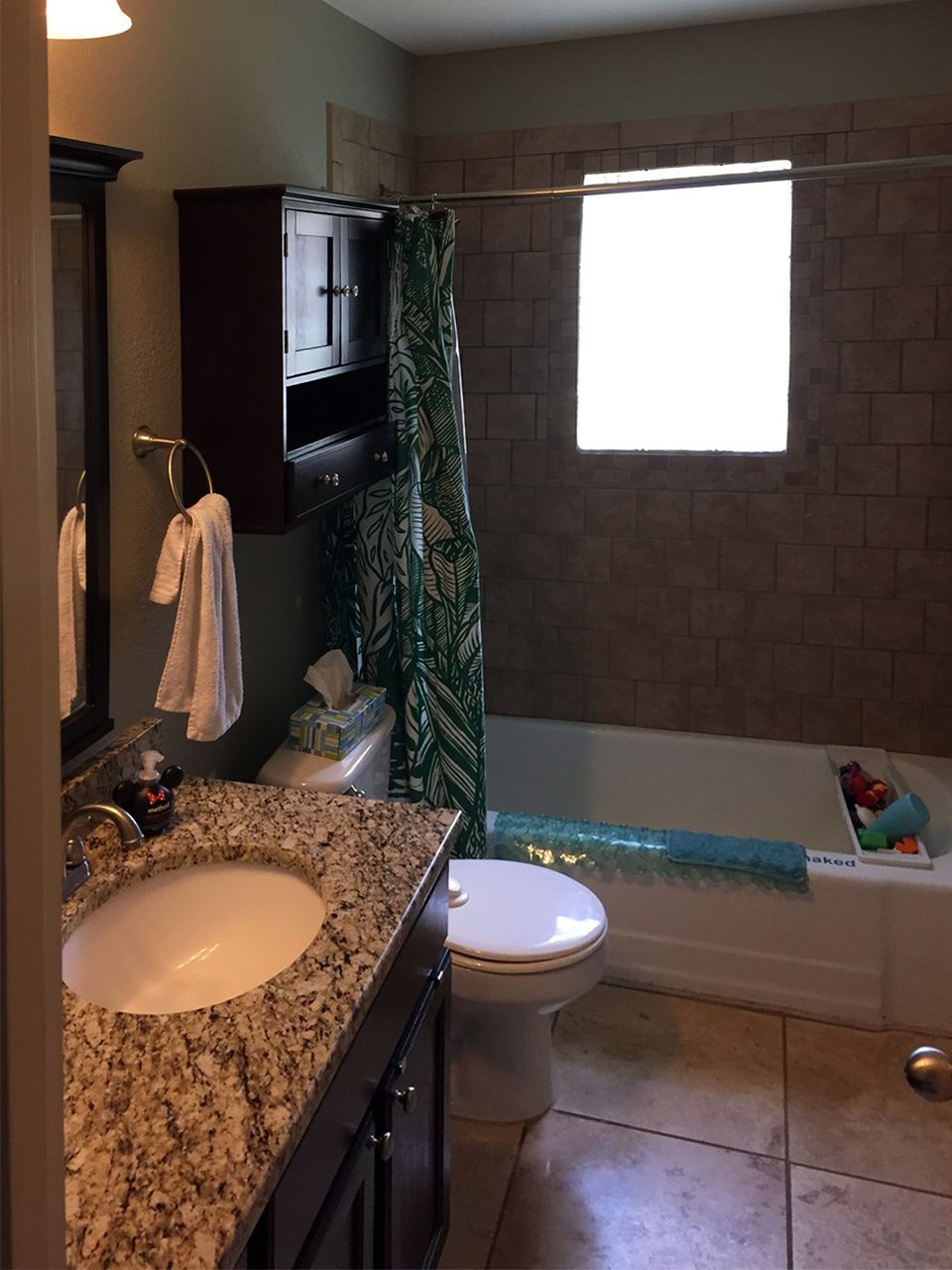 The clients wanted a functional and peaceful feel for the children's bathroom, similar to a spa but not too formal. They removed the original built-in angle tub and replaced it with a rectangular bathtub and shower, creating a balanced focal point on the back wall. While the footprint remained the same, the entire bathroom was taken down to the studs and every finish and fixture was replaced.