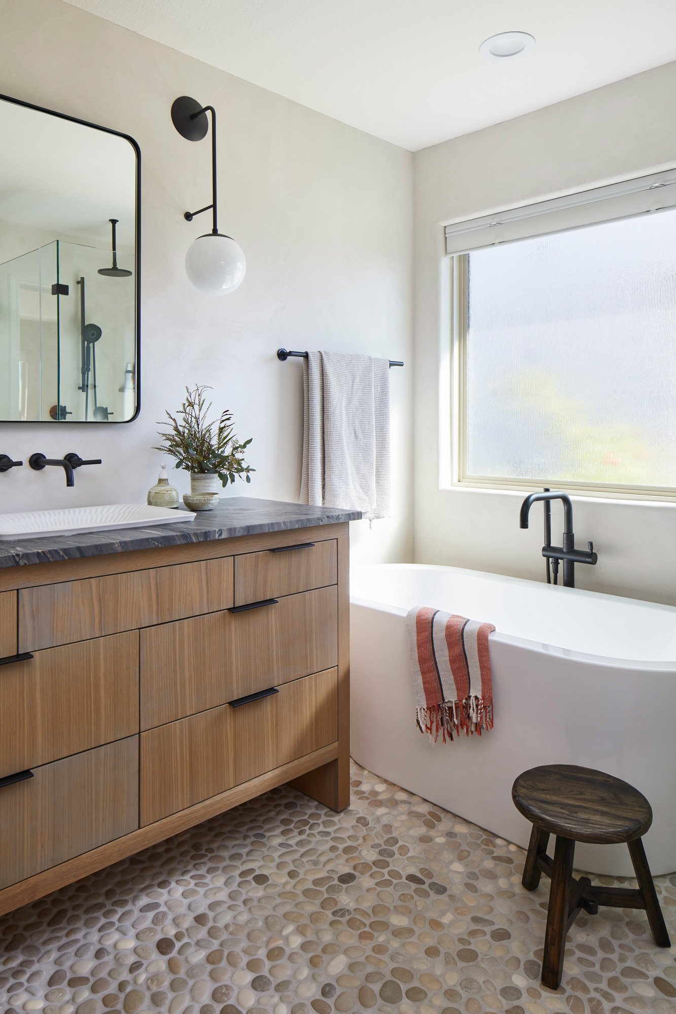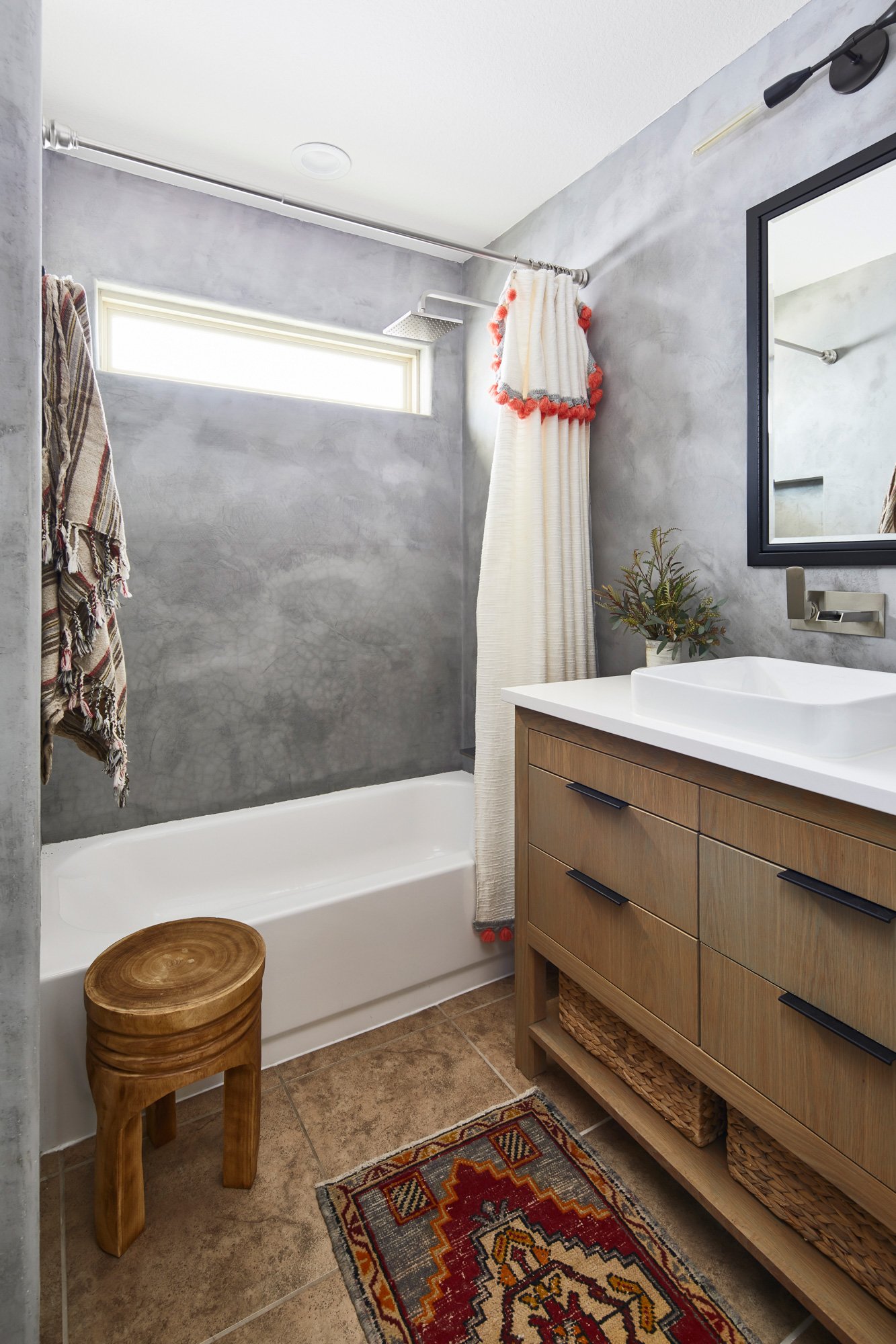A preexisting tract home finds calmness, creativity and brightness in a revitalized master bathroom, closet and guest bathroom remodel.