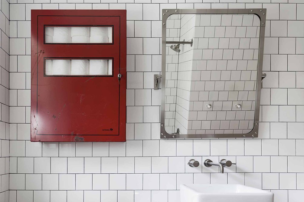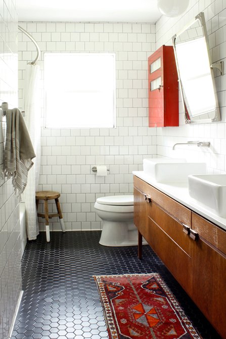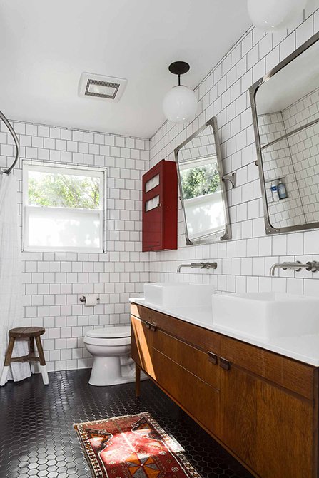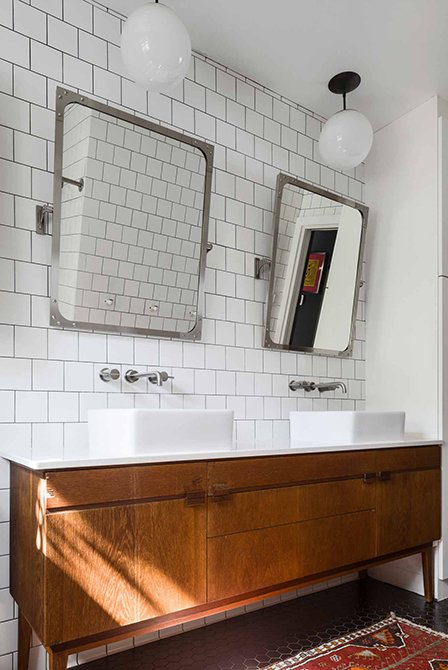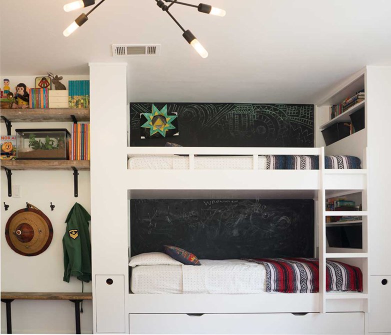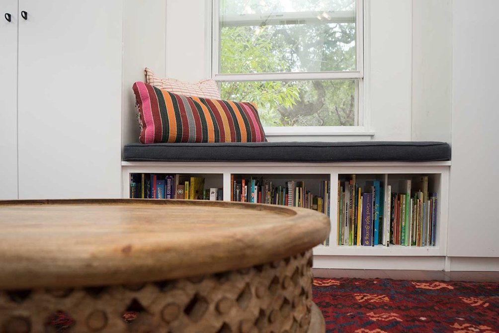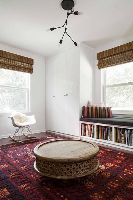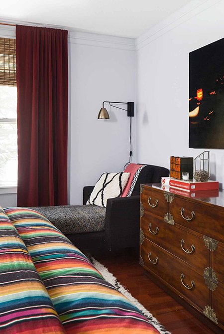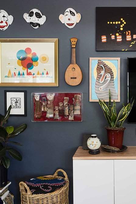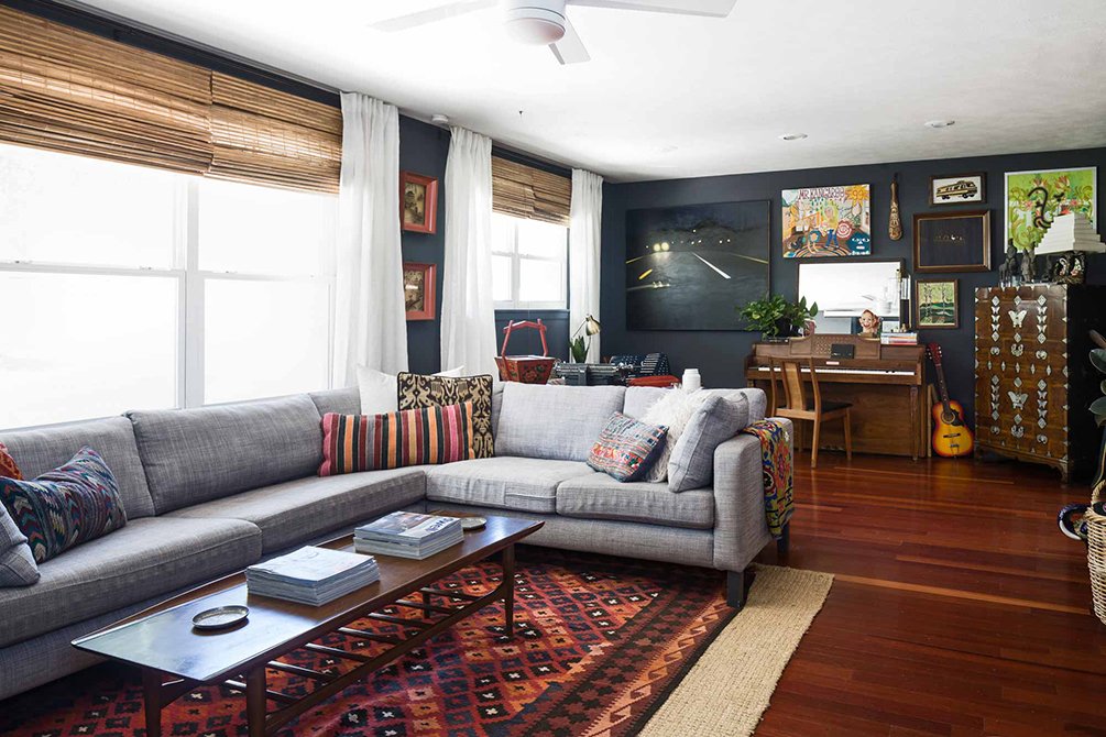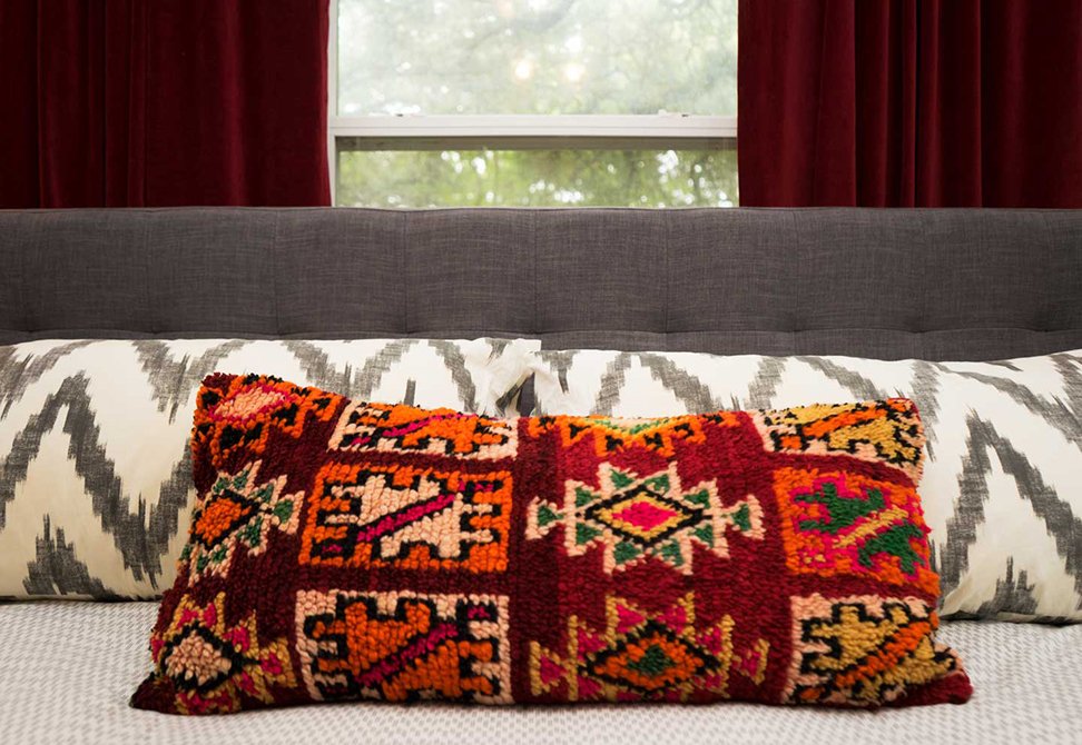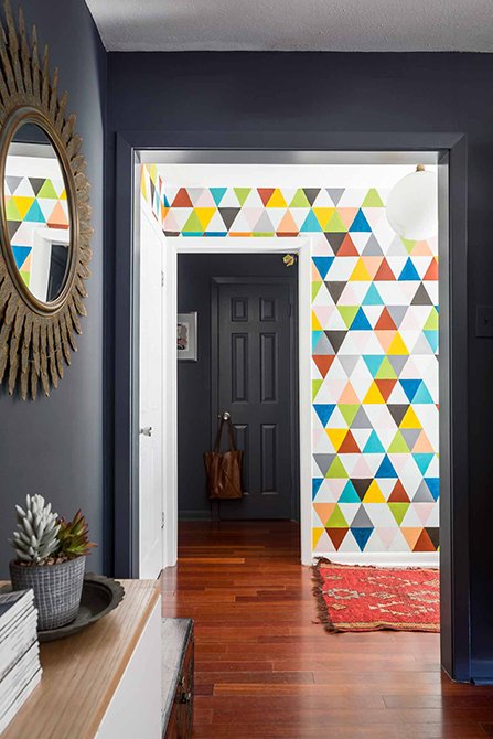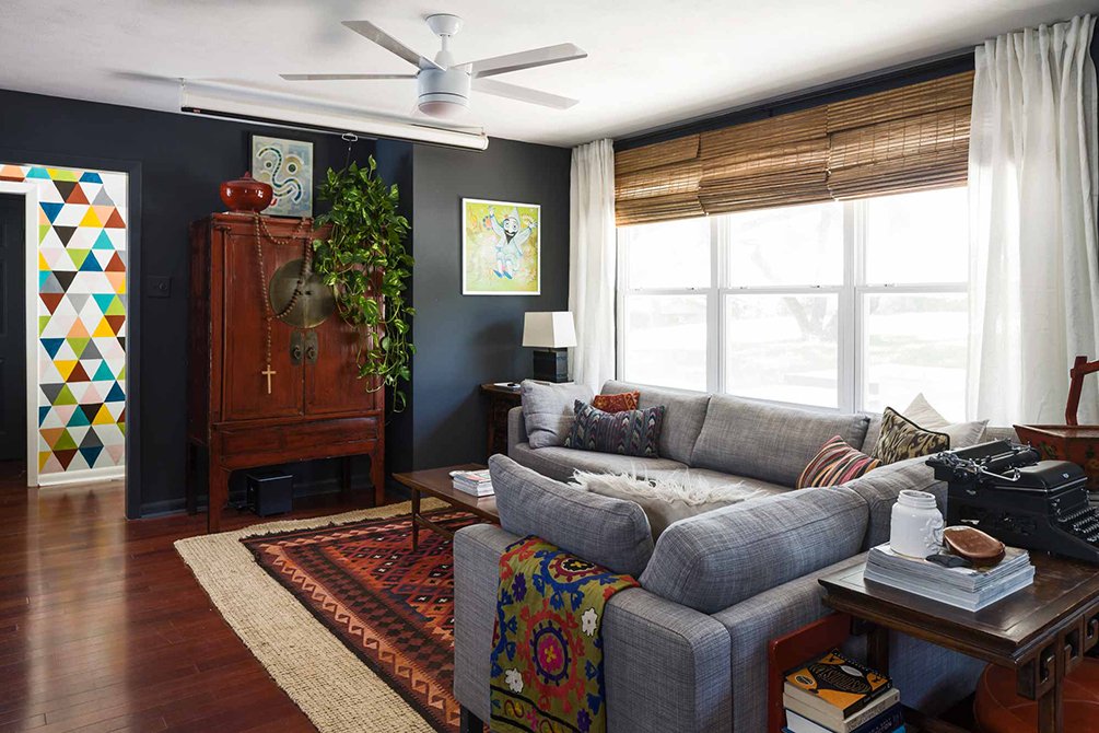 This eclectic and welcoming living room is layered with multiple antique pieces, custom artwork and a hand painted geometric hallway that invites you in.