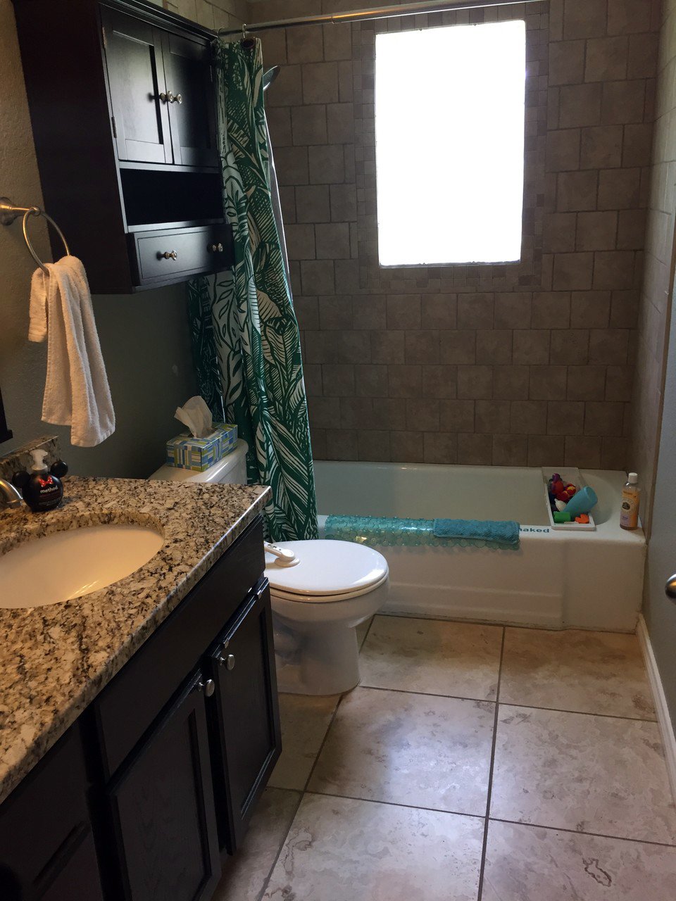 The clients wanted a functional and peaceful feel for the children's bathroom, similar to a spa but not too formal. They removed the original built-in angle tub and replaced it with a rectangular bathtub and shower, creating a balanced focal point on the back wall. While the footprint remained the same, the entire bathroom was taken down to the studs and every finish and fixture was replaced.