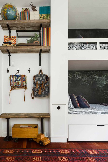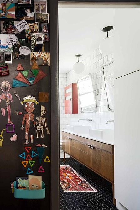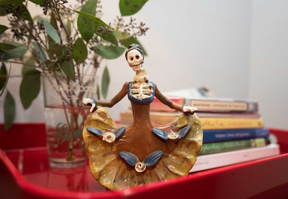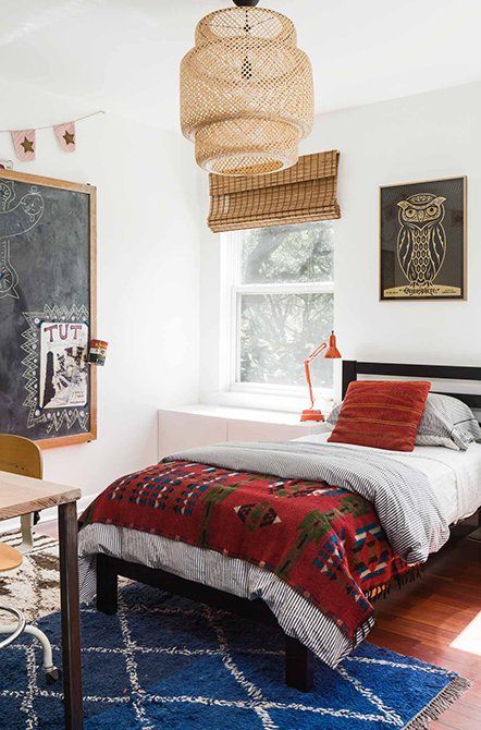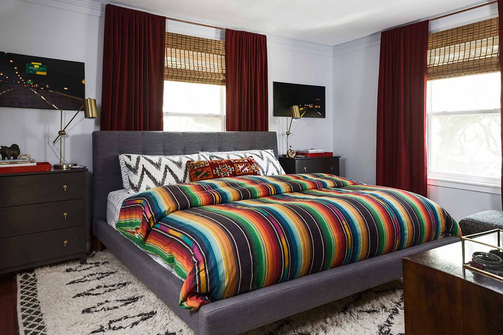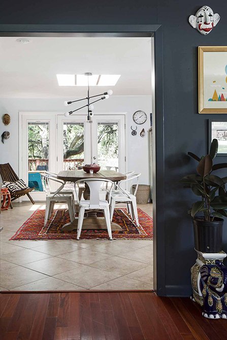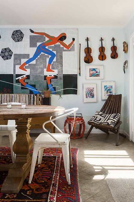 This eclectic and welcoming living room is layered with multiple antique pieces, custom artwork and a hand painted geometric hallway that invites you in.
